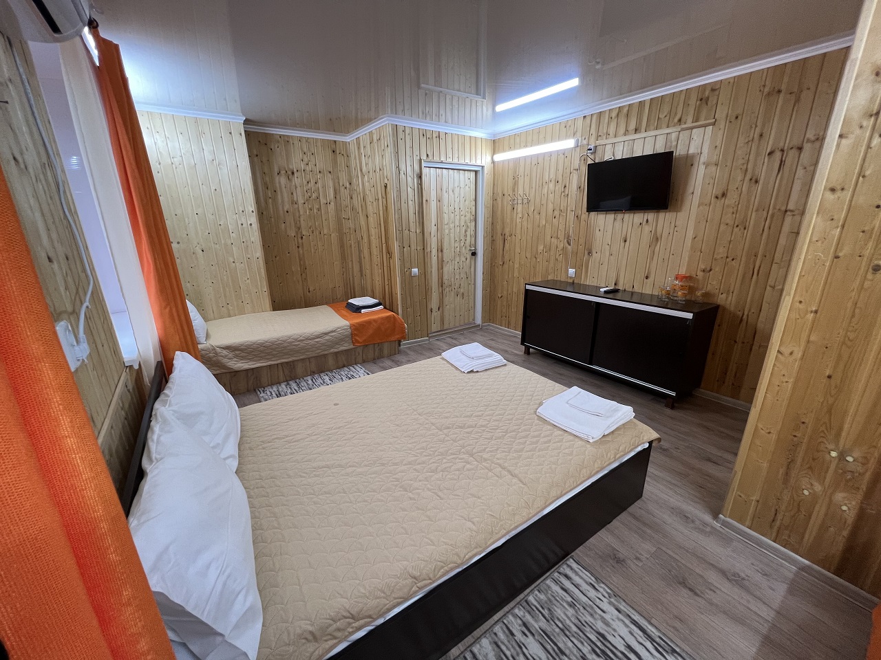 Уютный четырехместный номер. В номере одна двуспальная и одна односпальная кровати, прикроватные тумбочки. Так же номер оборудован санузлом с душем, умывальником и унитазом.